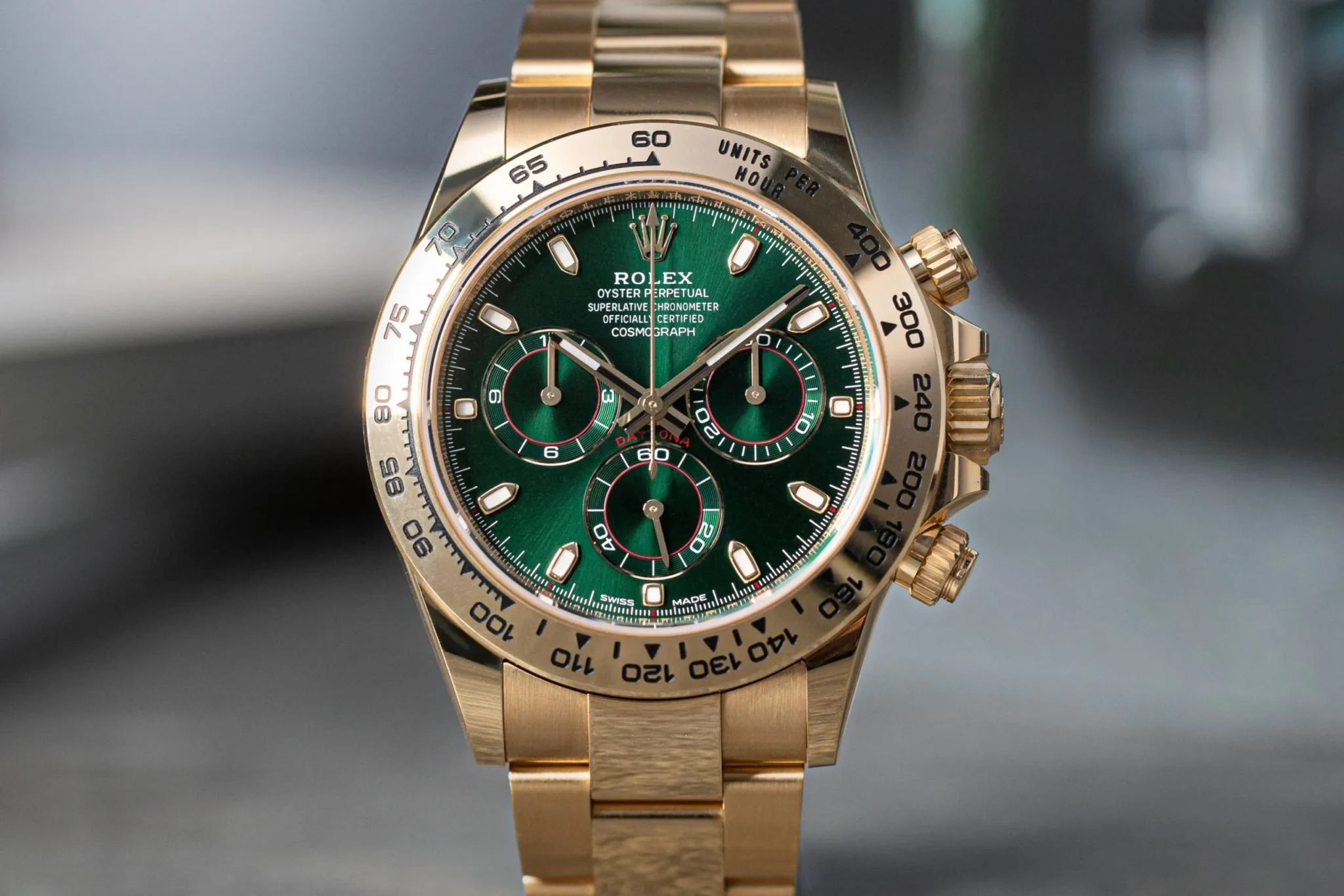 The Rolex John Mayer Daytona features a yellow gold case with a vibrant green dial and earned its nickname after musician John Mayer was spotted wearing it, boosting its popularity. While not an official Rolex name, it shows how celebrity influence can shape watch desirability. The watch resembles standard yellow gold Daytonas but the distinctive green dial commands a premium in the pre-owned market, starting around $70,000, especially as vintage-inspired colors grow in popularity.