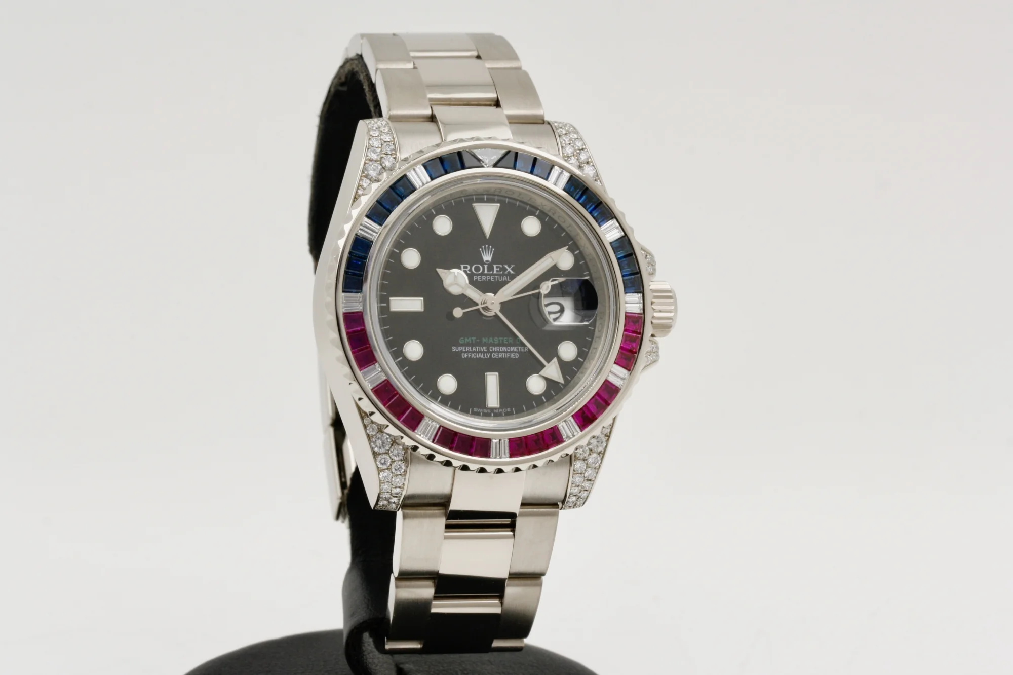This unique GMT-Master II combines the iconic “Pepsi” bezel in white gold with a mesmerizing meteorite dial, while many prefer to call it “Meteorite Pepsi”, we consider the Red and Blue color combination with the meteorite dial is more suitable for a “Superman” watch.