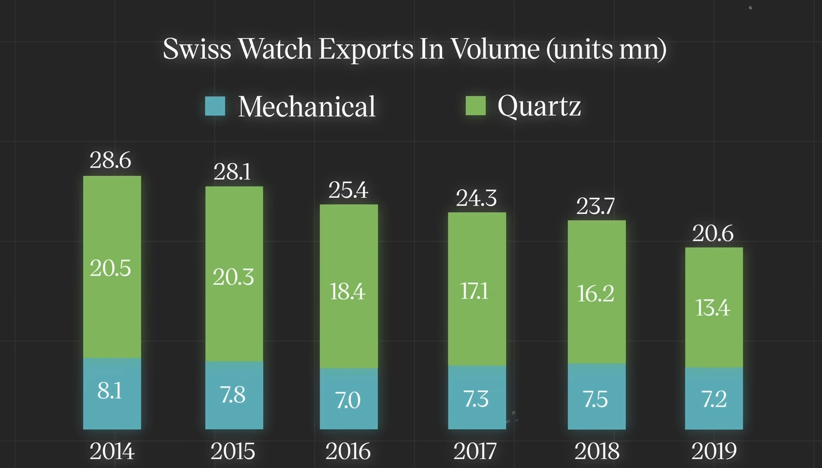Since the rise and popularization of smartphones, you could argue that owning a mechanical watch, or any watch in general, is no longer a necessary tool for everyday life. Yet, despite this, mechanical and especially luxury watches have been relatively steady. If you look at the broader concept of Swiss exports, it does tell a bleak story for affordable quartz watch production, with total Swiss watch exports dropping from 28.6 million in 2014 down to 20.6 million in 2019, a drop of nearly 30%. But as you shift over to mechanical watches, you will notice that the market has not seen the collapse that you might expect in this period. You do see roughly an 11% drop in production, mostly as a byproduct of the more attainable end.